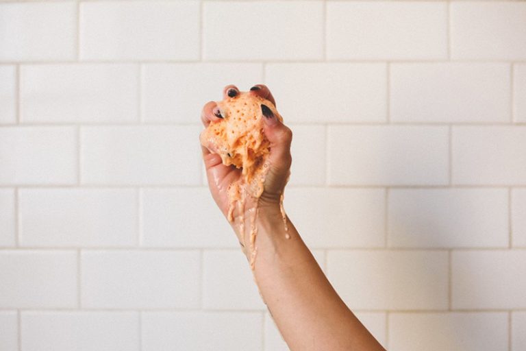 Start with lathering Soaked into a puff and let it soak on your body for about 30 seconds. The more bubbles, the better. Rinse, then follow up with the CBD sugar scrub. Perfect for dry winter feet and elbows.