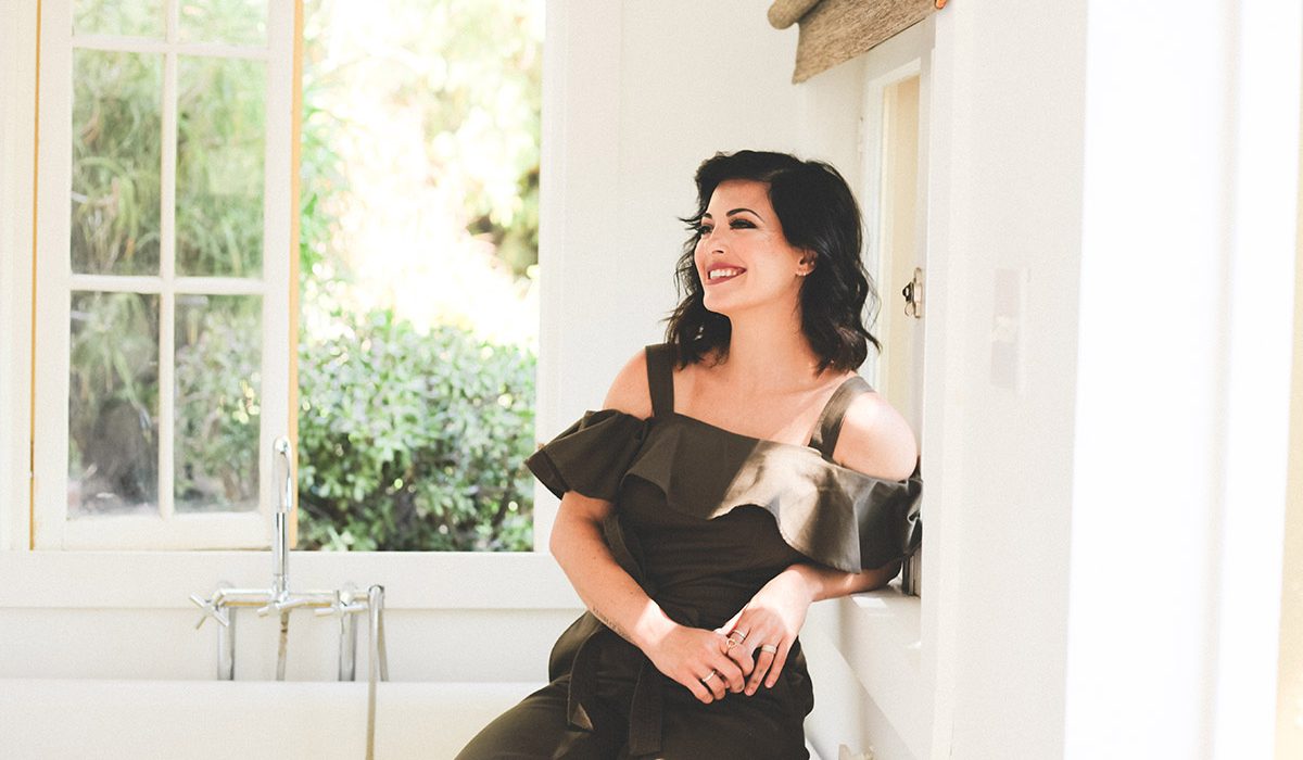 Stacey Bendet in a bathtub holding a nourishing CBD bath bomb from the Kush Queen X Alice + Olivia Self-Care collection in either hand, next to a stack of boxed bath bombs.